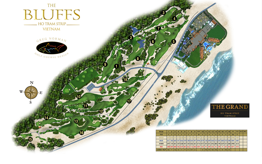 Sân golf The Bluffs được thiết kế bởi tay gôn huyền thoại Greg Norman. Với diện tích 2.300 m2 cùng lợi thế địa hình tự nhiên tuyệt đẹp và dịch vụ khách hàng chuyên nghiệp, The Bluffs hứa hẹn sẽ là điểm đến chơi golf đẳng cấp mới tại Việt Nam và khu vực, thu hút các gôn thủ đam mê chinh phục những thử thách mới.