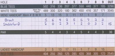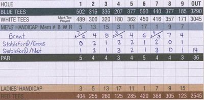 Hàng đầu tiên là điểm stroke play – là số gậy bạn đánh để hoàn thành một hố. Hàng thứ hai là điểm Stableford kiếm được tren hố đó. Cứ mỗi cuối 9 hố, cộng tổng điểm Stableford lại, và tại cuối hố 18, cộng 2 điểm mỗi nửa 9 hố lại để được điểm Stableford tổng.
