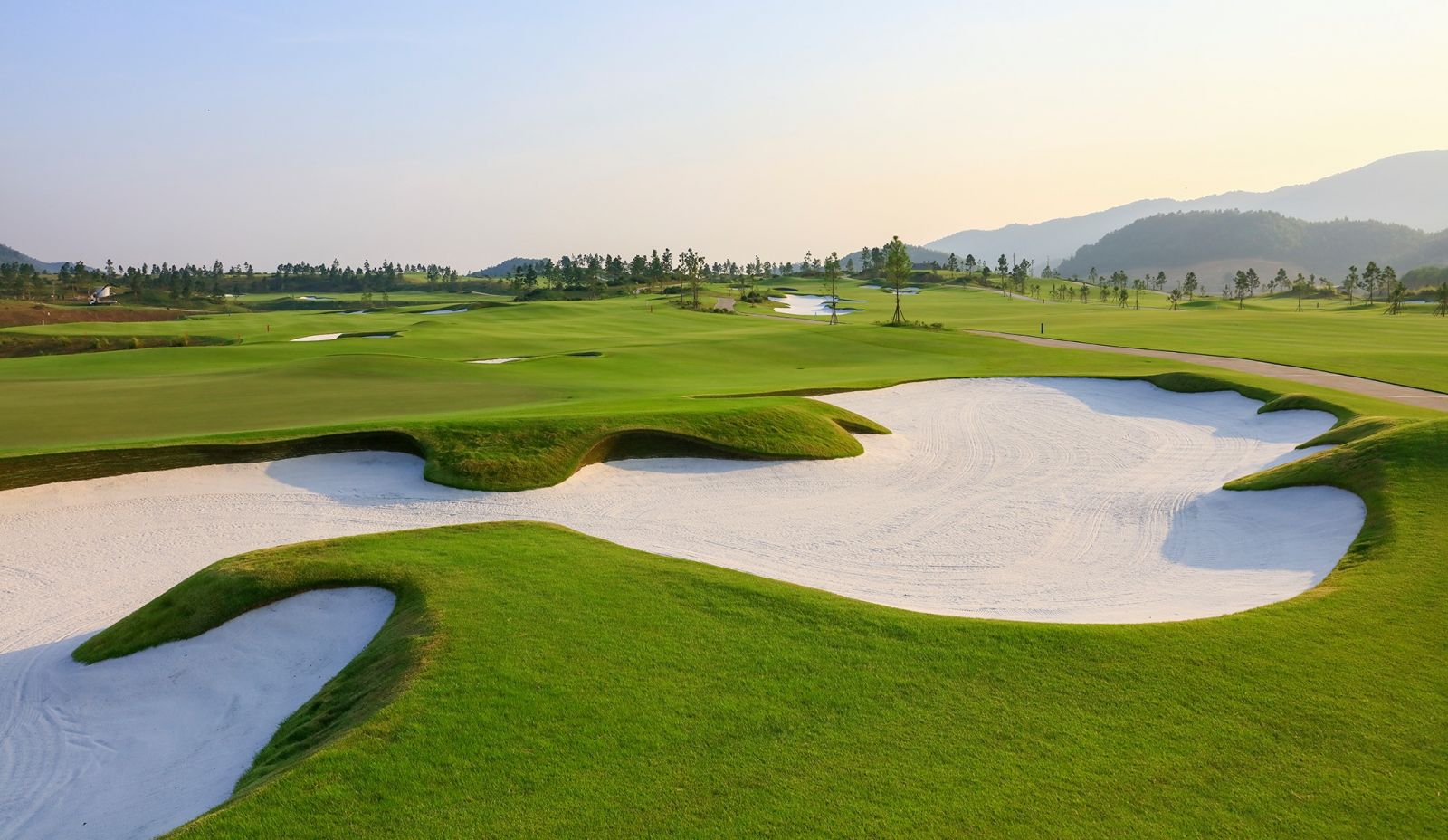 Những thảm cỏ xanh mượt như nhung trải dài khắp nơi, dẫn lối cho những bước đi nhẹ nhàng của các golfer. Phía xa xa, những dãy núi hùng vĩ, trùng điệp ôm lấy như cánh tay ôm trọn cả một vùng, mang đến cảm giác bình yên, gần gũi với thiên nhiên.
