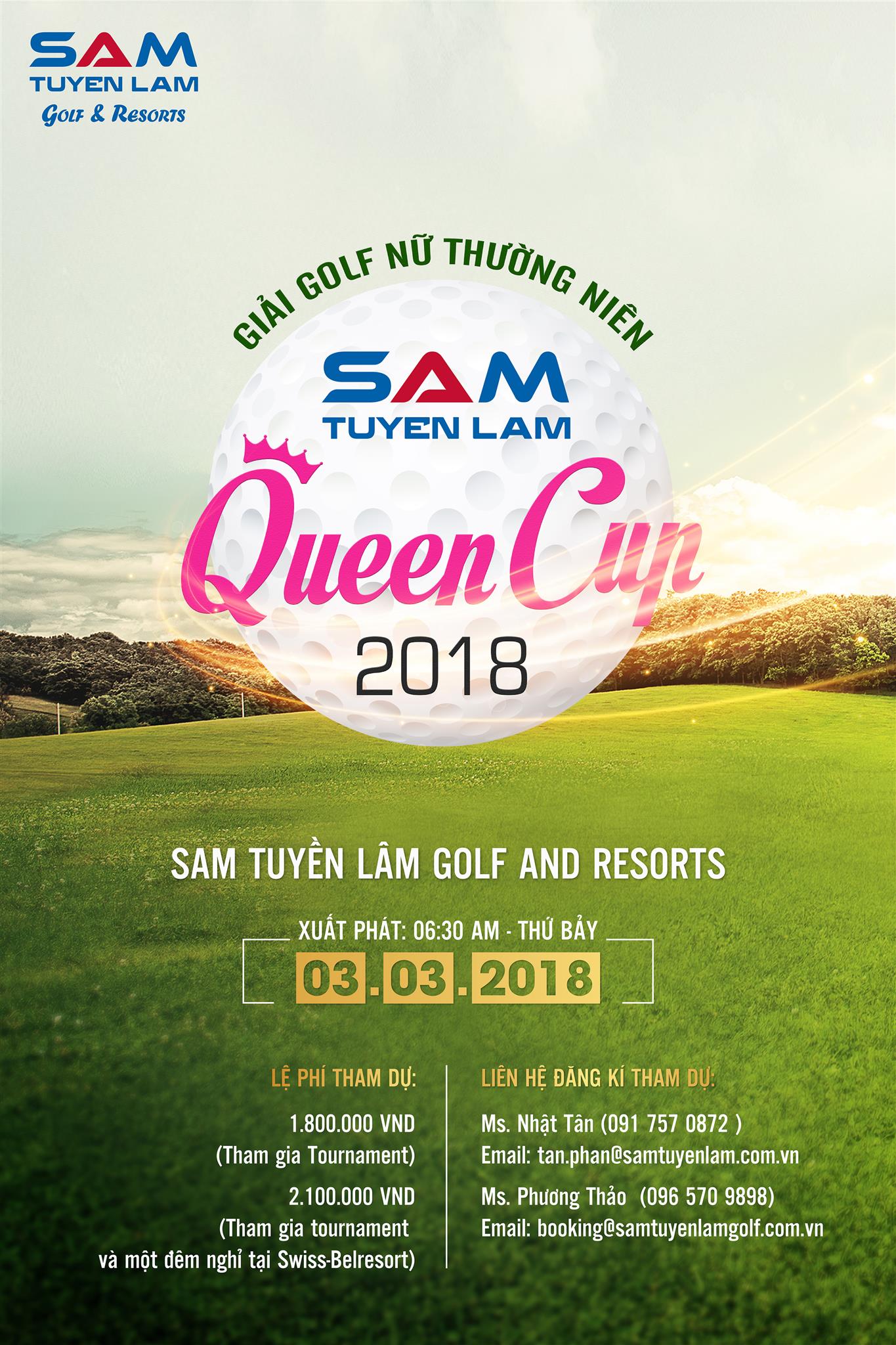Queen’s Cup 2018 sẽ diễn ra vào Thứ bảy ngày 03 tháng 03 năm 2018 tại sân golf SAM Tuyền Lâm, Đà Lạt. Mục đích của giải là Nhằm mục đích tôn vinh vẻ đẹp của người phụ Nữ Việt Nam, nhân dịp ngày Quốc tế Phụ nữ 8/3. Không chỉ thế, giải còn là một sân chơi bổ ích dành cho các gôn thủ nữ thi đấu, giao lưu mở rộng mối quan hệ với các gôn thủ nữ đến từ các Câu lạc bộ, hội gôn và doanh nghiệp trên cả nước.