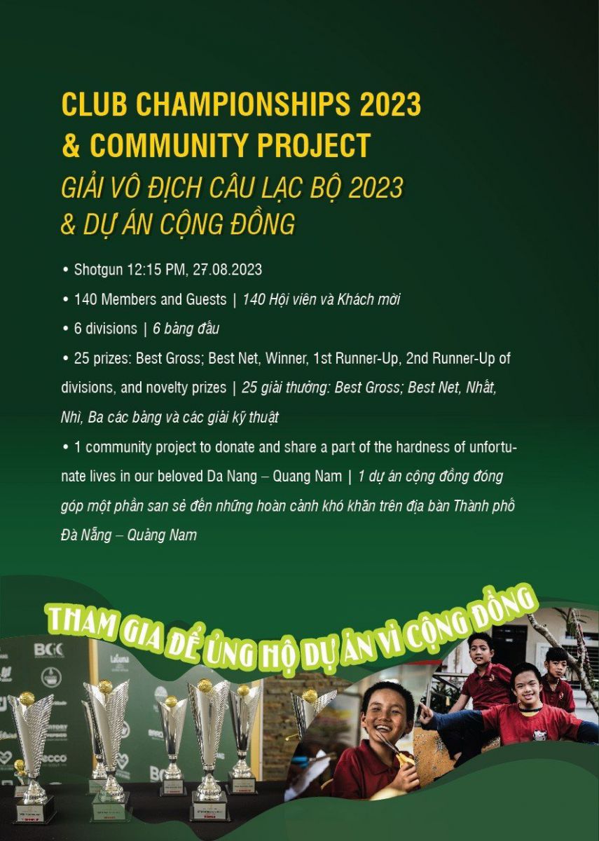 Đã 12 năm kể từ lần đầu tiên Giải Vô Địch Câu Lạc Bộ - Club Championships được tổ chức tại Montgomerie Links Golf Club và trở thành sự kiện gôn thường niên gắn liền với những thông điệp cộng đồng đầy ý nghĩa. Montgomerie Links Golf Club vô cùng tự hào chào đón Giải Vô Địch Câu Lạc Bộ lần thứ 13 chính thức trở lại vào ngày 27 tháng 8 năm 2023. Hơn cả một giải đấu, Giải Vô Địch Câu Lạc Bộ 2023 là tâm điểm của chuỗi các hoạt động hoành tráng diễn ra xuyên suốt 3 ngày 25, 26 và 27 tháng 08 năm 2023 bao gồm Golf Fair 2023, dự án cộng đồng cùng các buổi tiệc kết nối bên lề “BBQ & Draft Beer”, hứa hẹn mang đến một sân chơi chuyên nghiệp và không khí triển lãm các sản phẩm Gôn sôi động và bùng nổ cho gôn thủ và khách tham quan. Đây cũng chính là bước tiến mới của Montgomerie Links Golf Club, tiếp tục khẳng định vị thế trong ngành công nghiệp Gôn tại miền Trung.